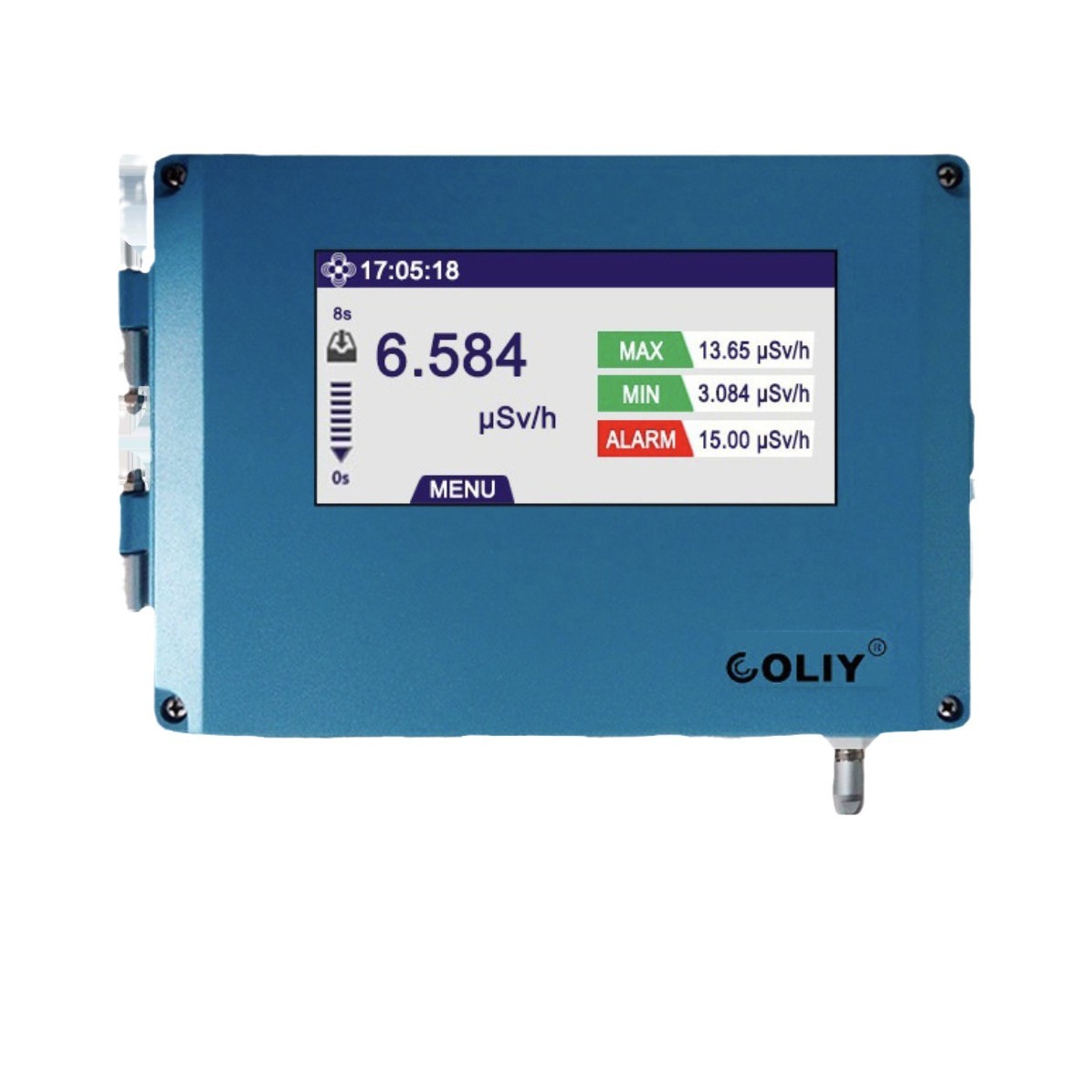 报警功能:声音报警,可自由设定报警值,缺省设置为10uSv/hr